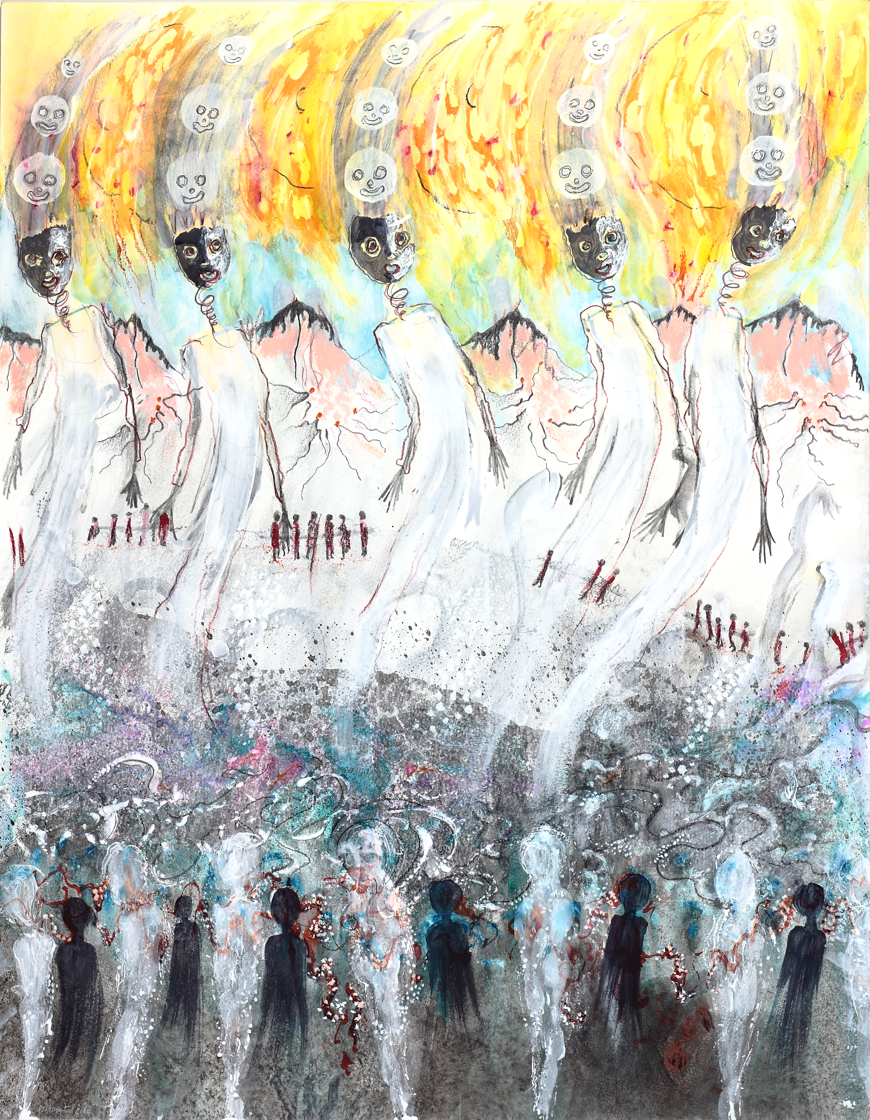 "Brouhaha" donc : le titre de l'exposition et celui d'un premier grand dessin de Christian Lhopital, datant de 2020. Celui-ci entraîne le regard de celle ou de celui qui le regarde en vortex et en tourbillons concentriques avec des traits noirs qui s'effilochent et grimacent, des figures cul par-dessus tête, des visages qui se dilatent au gré du mouvement concentrique et vertigineux... jusqu'à l'œil du cyclone ou, aussi bien, jusqu'à la bonde de l'évier où l'eau s'écoule. Ce pourrait être la baignoire de Psychose d'Alfred Hitchcock, mais sans le sang ni le meurtre, juste la danse des formes et la drôlerie ou la tragédie des métamorphoses. « Passer l'amour à la machine », chantait Alain Souchon, passer le sérieux figé des formes à la machine, dessine Christian Lhopital.
