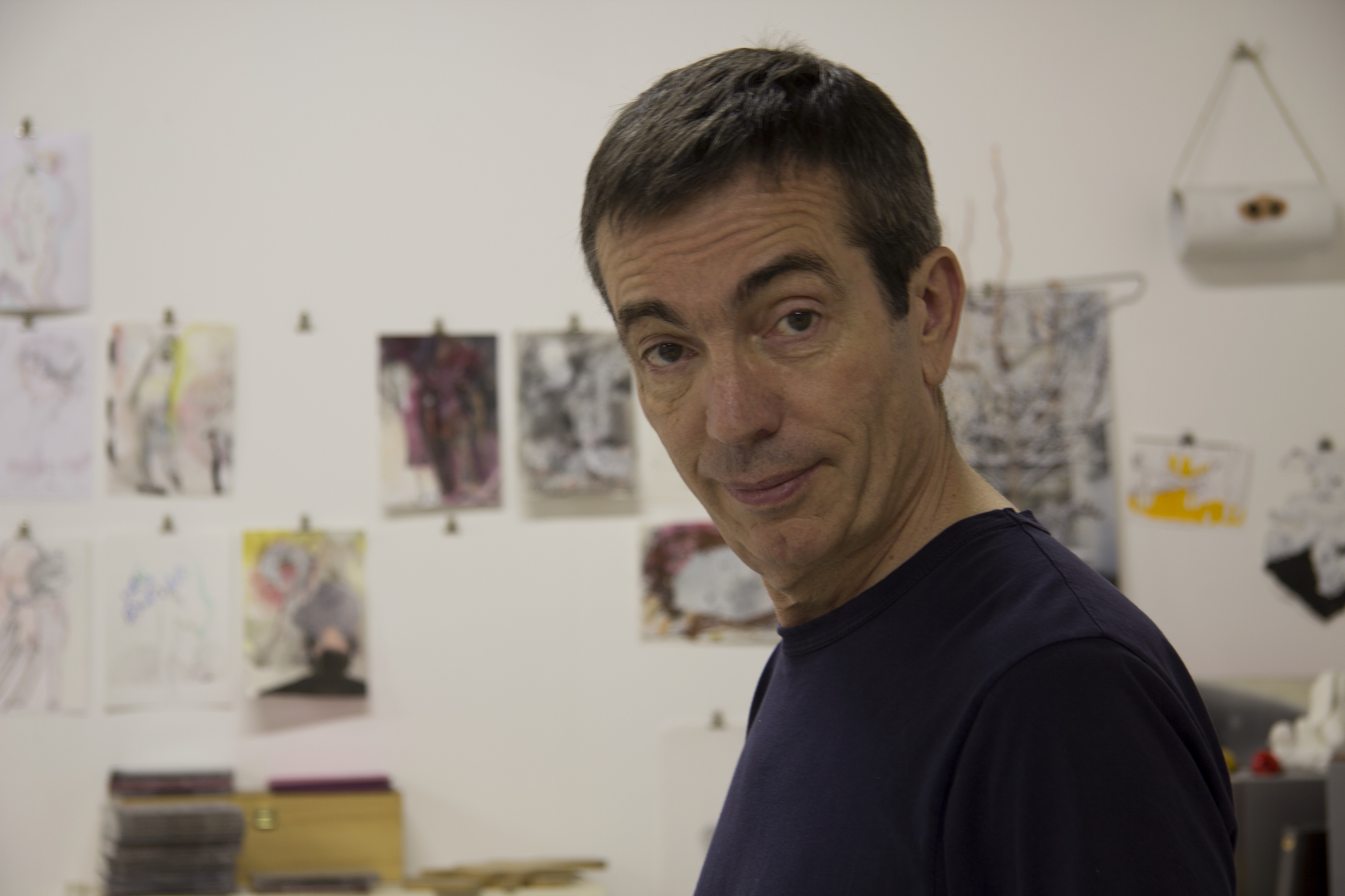 Quant à ses sources, l'inspiration est aussi bien puisée dans des croquis de la vie quotidienne, des images publicitaires, des captures d'écran sur internet, des illustrations de magazines ou des images de cinéma (d'Ingmar Bergman à Alejandro Jodorowsky)... Le cinéma qui lui inspire notamment les trois dessins Ailleurs présentés à l'URDLA, faisant partie de sa série de dessins cinématiques, avec des figures qui à la fois se répètent et se transforment lentement comme sur une pellicule cinématographique. On découvrira aussi à l'URDLA deux autres séries et facettes moins connues de l'artiste : de belles natures mortes aux bouquets éclatants de couleurs, et ses grands Espaces troubles démultipliant les cadres, les plans et leurs interstices troubles.