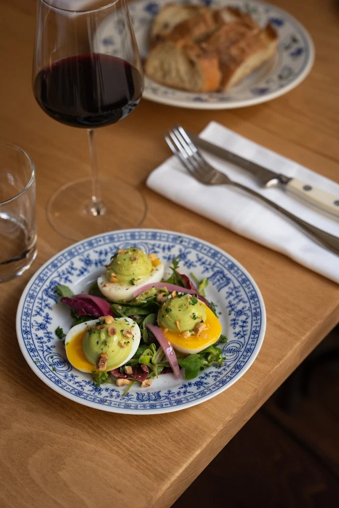 La cuisine ? Elle se revendique « à la fois tradi et moderne », ce qui, a priori, n'a pas de sens. Disons que la carte s'autorise quelques exubérances (l'œuf mayo est relevé de sriracha, le rôti de bœuf de l'Aubrac s'accompagne d'une sauce aux algues, le filet de dorade est mouillé d'un bouillon à la citronnelle, le cœur coulant au chocolat est servi avec une chantilly à la fleur d'oranger, etc.), même si la formule déjeuner lorgne vers un répertoire plus classique. Lors de notre venue, on commençait à midi par un velouté de courge, servi bien chaud, ponctué d'éclats de châtaigne et de croutons au beurre. Une entrée en matière convenue mais bien réalisée et adéquate à la saison. Ensuite, une cuisse de poulet fermier, charnue, rôtie, posée sur du boulgour, accompagnée de carottes et d'une crème de comté fumée. Enfin, un excellent riz au lait - son côté réconfortant était surligné par un caramel au beurre salé, et le goût de la céréale était accentué par des grains soufflés. On lui a fait un sort au comptoir sur lequel étaient disposés les vins, servis au verre, dont un rare rouge de la famille Arena en Corse (en l'occurrence le Carco d'Antoine-Marie), une famille de vignerons qui a été pionnière sur l'île, à la fois pour la biodynamie, pour les vinifications "nature" et pour faire de Patrimonio un grand terroir. Trouver ce genre de bouteille dans un lieu tout juste ouvert et qu'on voyait plutôt faire la part belle aux cocktails, c'est, en soi, une bonne nouvelle.