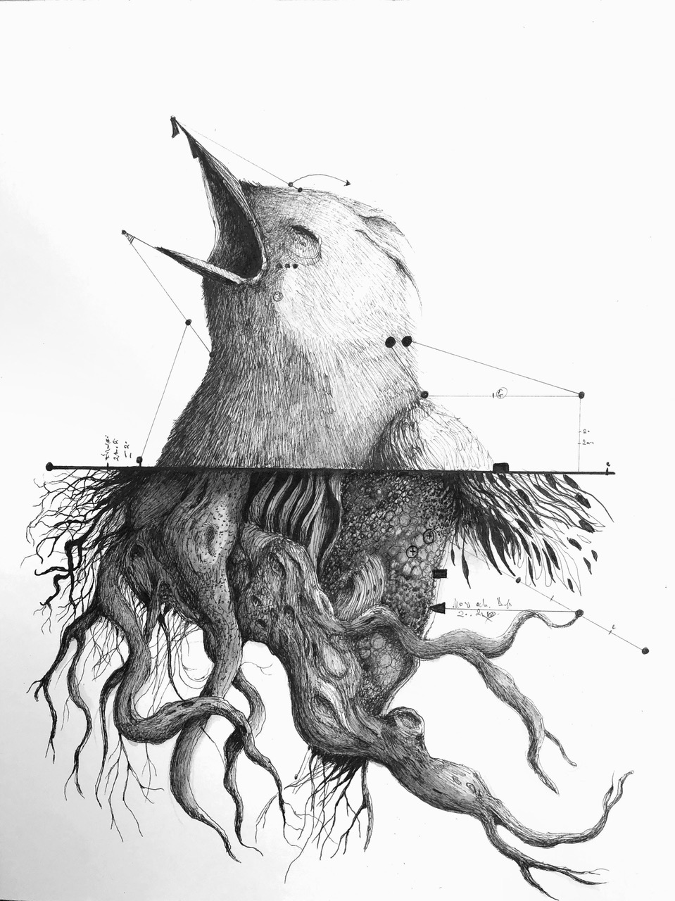 Arts graphiques / Le retour d'Éric Lacombe à la galerie est l'occasion imprescriptible de découvrir son nouveau corpus de dessins et œuvres mixtes où le corps, l'animal et le paysage deviennent champs d'expérimentation. À travers un travail procédant d'une exploration méthodique, lignes, tracés et fragments anatomiques s'organisent selon une logique quasi scientifique, aussitôt troublée par l'irruption du trouble et de l'indéterminé. Entre relevé objectif et glissement poétique, Lacombe confronte la rigueur du schéma à l'opacité du vivant, sans jamais dissiper entièrement son mystère. FM