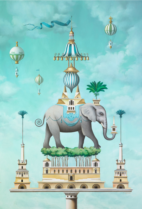 Peinture / Chez Carole Gourrat, l'animal devient emblème et architecture, selon une logique héraldique déplacée dans le songe. Ours, héron, girafe ou cheval abandonnent leur statut de créatures pour se transformer en formes structurantes : ils portent, soutiennent, systématisent. Tout semble régi par une gravité inversée, chère aux cabinets de curiosités du XVIIIe siècle, où la raison se déguise en caprice et l'ornement s'avère être une entrée métaphysique : ce dernier ne décore plus, mais il ordonne et insuffle le sens. À la manière d'un bestiaire moral, chaque figure s'offre comme une énigme silencieuse, suspendue entre le théâtre du monde et la chambre secrète de l'esprit.