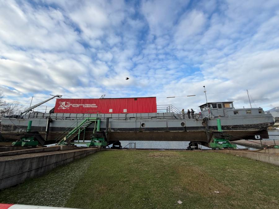 Photo : La péniche du Sonic sortie hors de l'eau © Cyril Masson