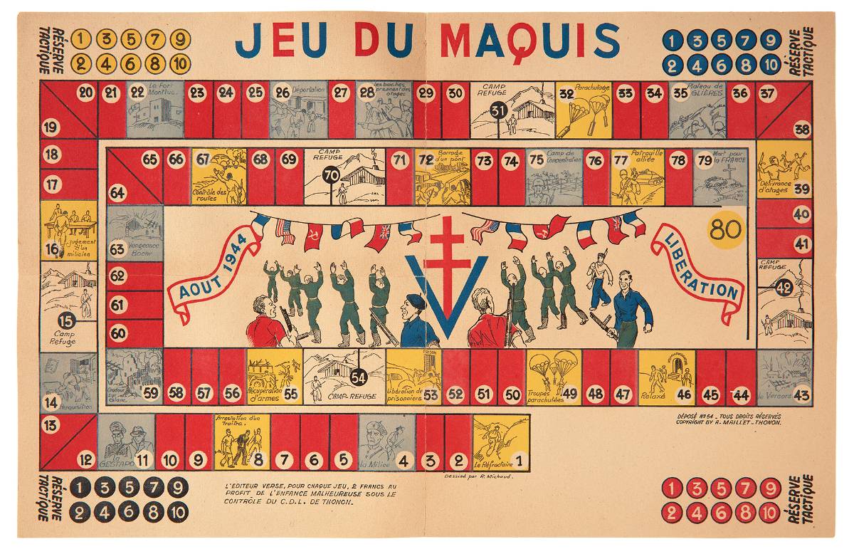 À Noël 1940, après l' « étrange défaite » (selon les mots de l'historien Marc Bloch), les écoliers ont été fortement encouragés à participer au concours "Une surprise pour le Maréchal". Quel en était le thème ? « Un coin de la France que le Maréchal aime tant ». On retrouve ces dessins, en diaporama, au CHRD. Des maisons, des champs de verdure en peinture ou, encadré, l'original de celui qui a reçu le premier prix. Le petit Parisien Gérard, 9 ans, a crayonné une ferme pleine d'animaux et a adressé un mot de remerciements à Pétain pour « avoir reconstruit la France ». Comme dans tout régime dictatorial, l'école est un cadre idéal pour diffuser sa propagande, la faire infuser. Dans la cour, on apprend via une note rédigée par l'inspection de l'enseignement primaire que les garçons jouaient au jeu de la rafle policière, les filles s'amusaient à faire la queue comme font leur mère face à la pénurie alimentaire. Les jeux de plateau destinés à amuser les enfants dans leurs foyers avaient pour rôle d'encourager la politique nataliste ou de valoriser les colonies.