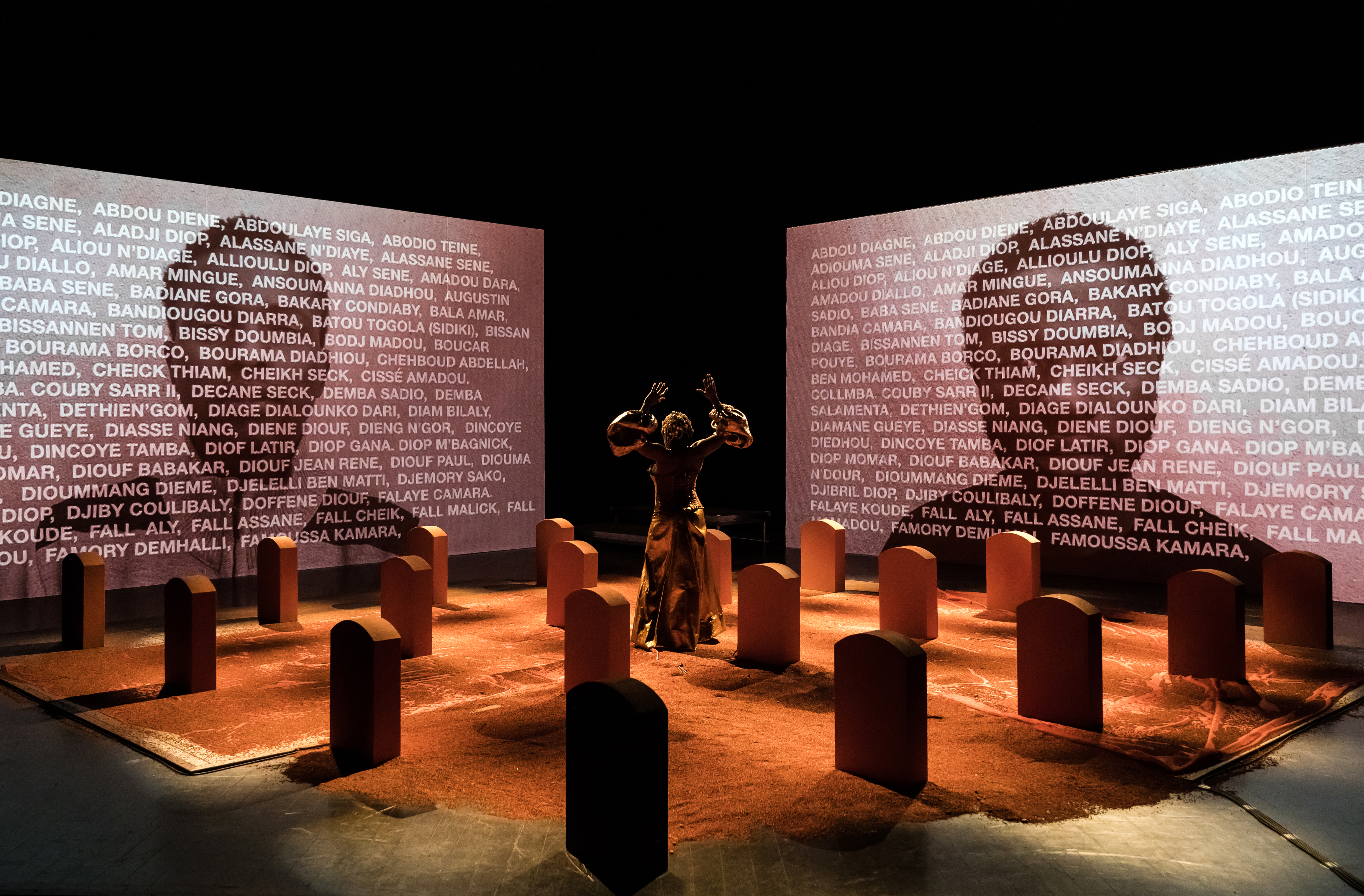 Si la partie fictionnelle, inégale sur la durée, s'intéresse à la vie des recrues et des habitant·es du bourg avant l'horreur, l'autre, plus historique, est passionnante et habilement imbriquée dans la narration pour, en quelque sorte, réparer l'histoire. Et donner des visages, des corps et des noms à ces soldats violemment oubliés. Des soldats parmi lesquels on trouve le grand-père du héros du Iench, le second spectacle qu'Eva Doumbia (qui construit donc une sorte de saga de pièce en pièce) présentera également à la Croix-Rousse, sept ans après sa création. La période est cette fois contemporaine afin de mettre sur scène la vie d'une famille noire - alors que « la famille au théâtre français est souvent bourgeoise, blanche », écrit Eva Doumbia en note d'intention. Une famille, comme tant d'autres issues de l'immigration, touchée par le racisme et les violences systémiques, ce que dénonce Eva Doumbia avec les armes du théâtre dans un geste artistique ample (son texte renferme de nombreuses couches). Nécessaire et politique.