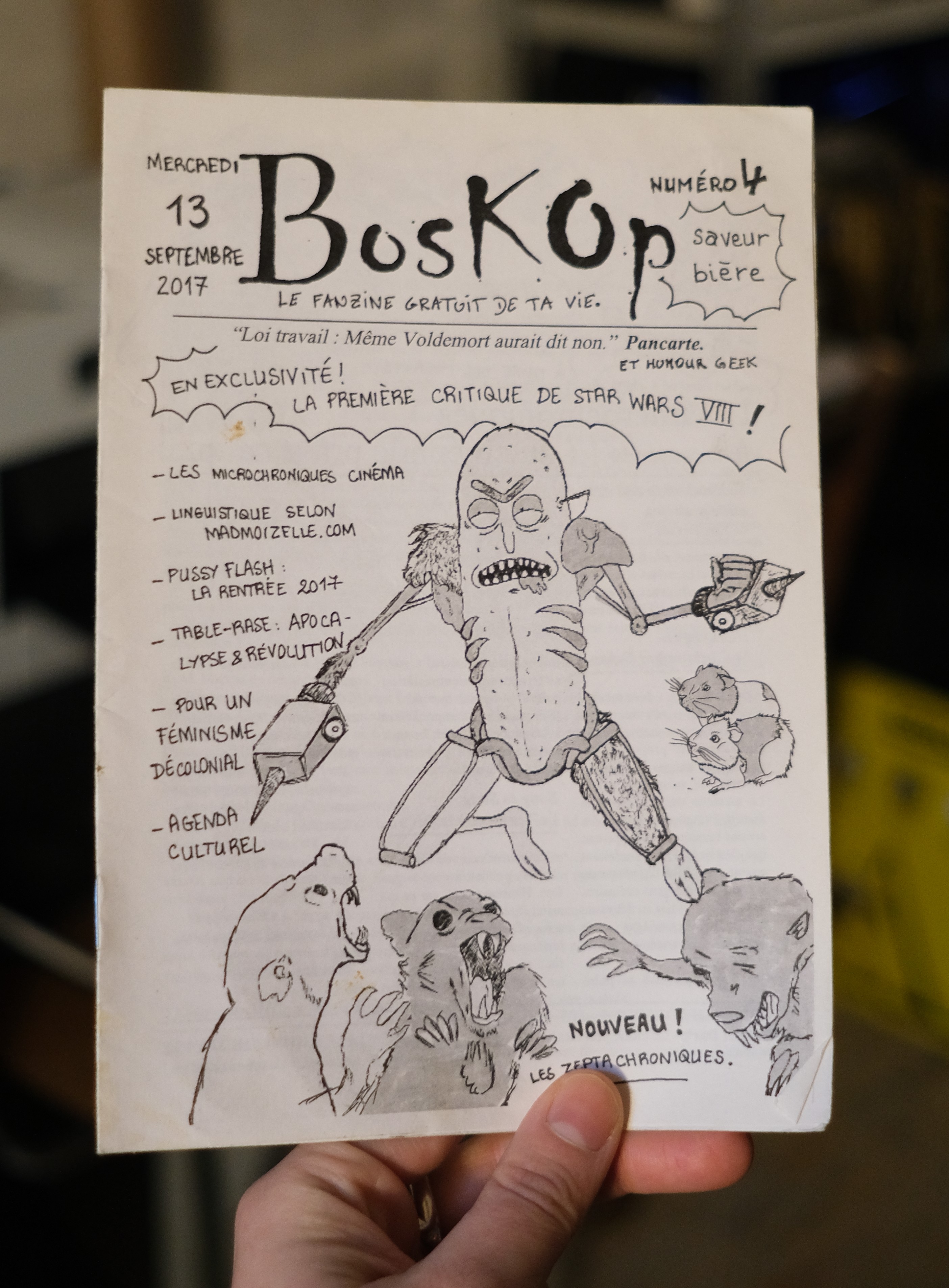 JJP : C'est arrivé de manière très surprenante, presque improbable, en 2023. L'artiste Tony H avait son atelier dans ce local commercial de la rue Sébastien Gryphe, il avait repris le bail du tapissier de quartier et y avait installé sa société d'art. C'est pour ça que le lieu était déjà pas mal atypique. Ça lui tenait à cœur que ça reste un lieu dédié à la culture, à la création, comme une galerie, il me l'a donc "passé" pour y programmer des expositions. On a dû effectuer quelques travaux et on a ouvert officiellement en septembre 2023. Le nom vient d'un fanzine que j'avais trouvé sur une table, à la fac, je l'avais trouvé très drôle. Je ne sais même pas qui l'a écrit. On a fait un fanzine à 300 exemplaires de 2017 à 2019 qu'on a appelé du même nom. Puis ce fut au tour de la galerie... J'aimerais bien que l'auteur du "Boskop initial" vienne me voir un jour. Ce serait magique.