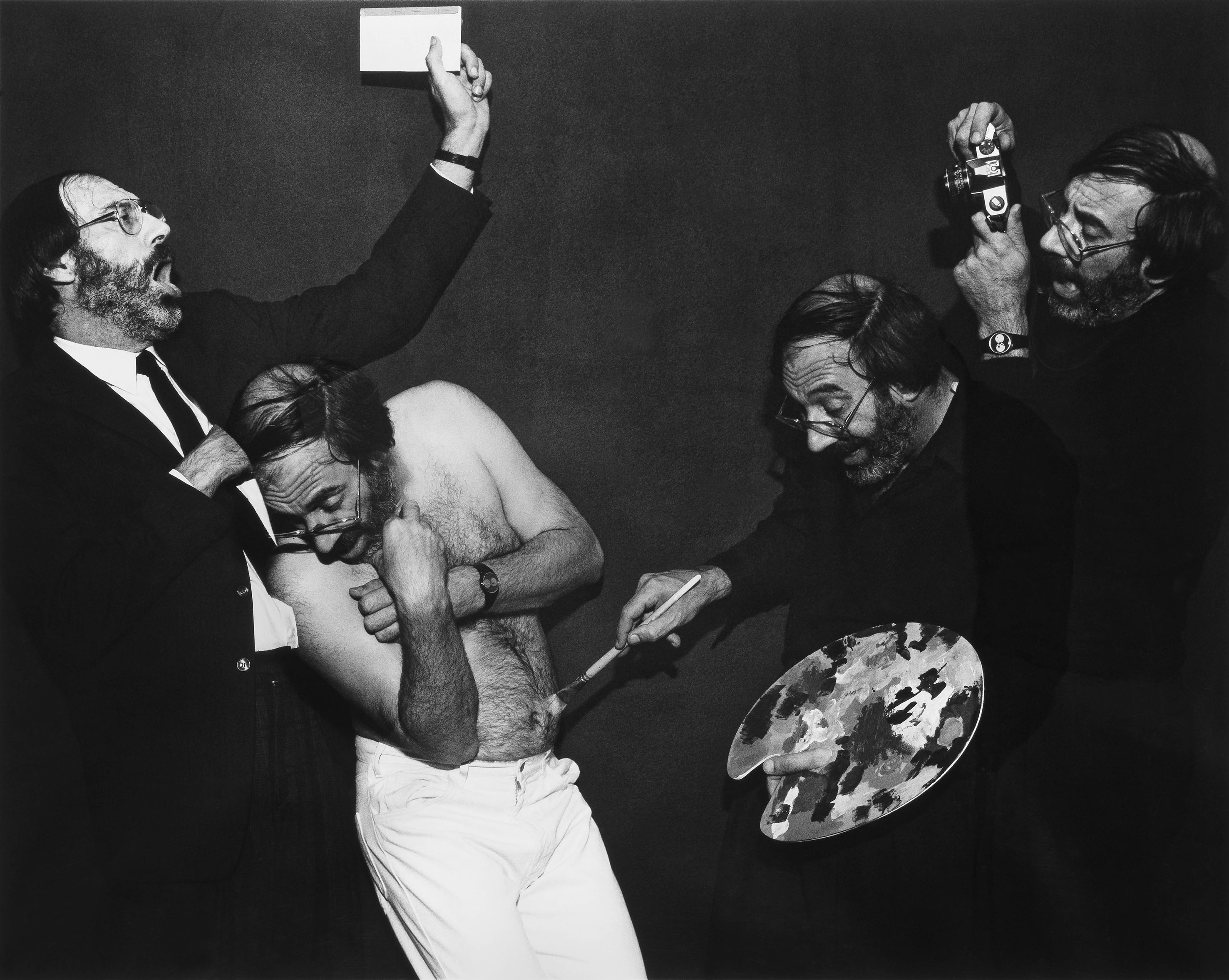 Une démultiplication du « moi », une métamorphose du même, une myriades de rôles joués, qui nous font souvent rire aux éclats, et qui, au-delà, jettent un pavé dans la mare d'une société inféodée à l'image, au spectacle et à la publicité. « Je me suis multiplié dans des compositions photographiques pour jouer tous les rôles du genre humain. L'humour et la dérision, omniprésents dans ce travail, sont les seules façons de détruire la vanité de la représentation de ma propre image : je joue ainsi le rôle de l'homme ordinaire, mais aussi celui de l'artiste, de sa place dans la société, en référence à l'histoire de la peinture » écrit-il.