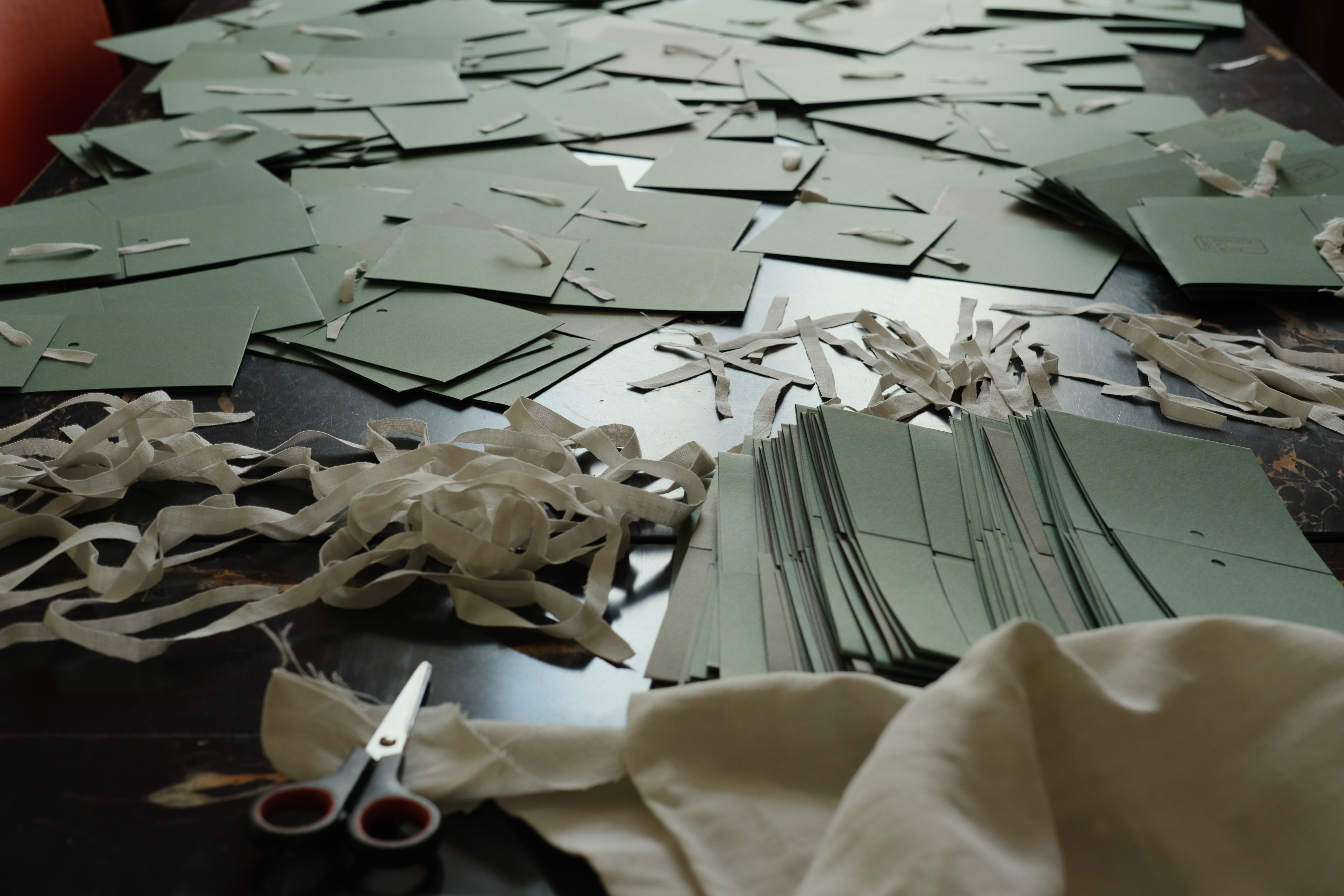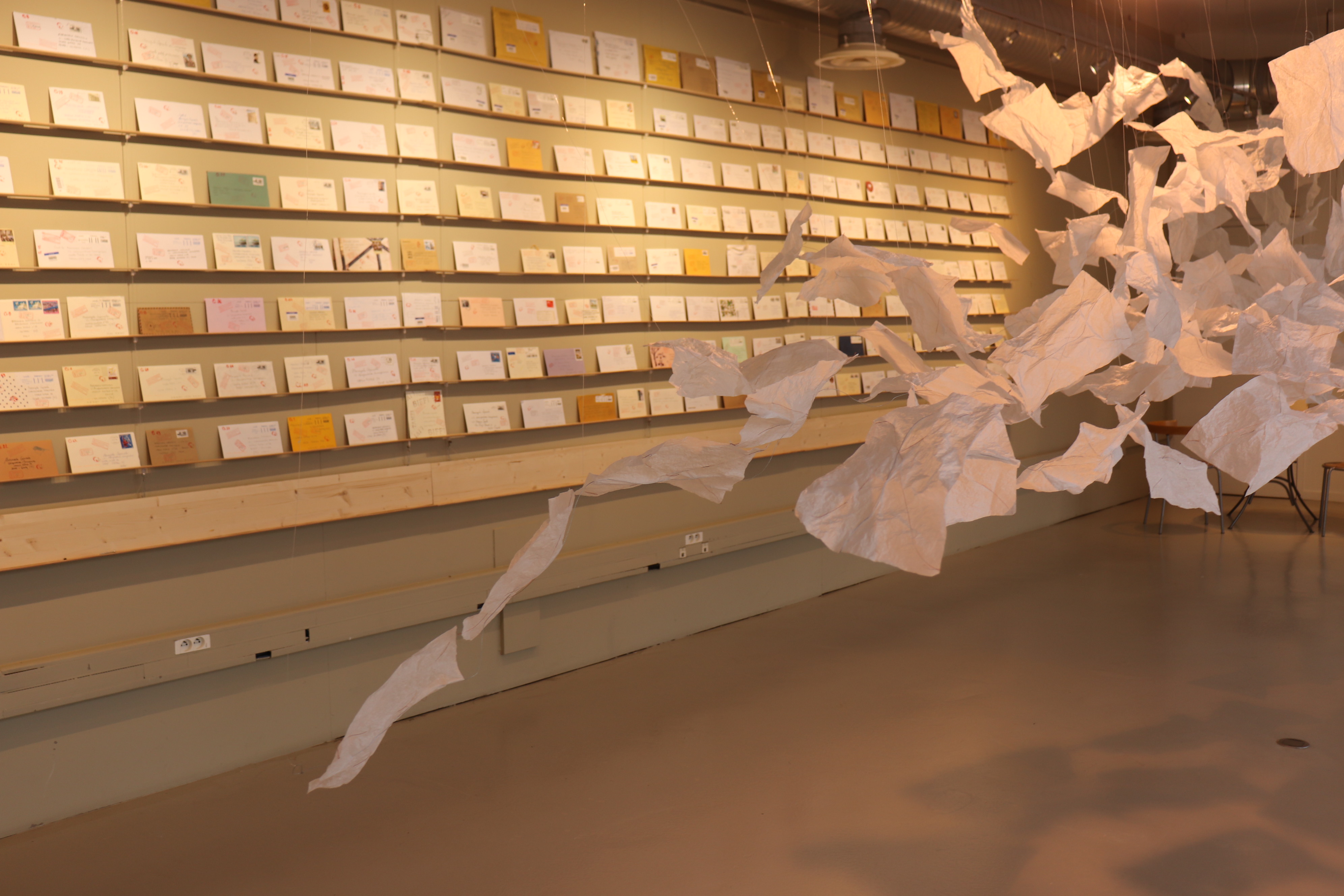 Les enveloppes issues des étapes italiennes constituent la mémoire du projet, son passé déjà mis en circulation. Le rouleau de lettres recopiées, à partir d'écrits des personnes internées, conservés dans les Archives départementales du Rhône, donne forme à un matériau resté inédit. Enfin, un nuage de feuilles blanches ouvre l'espace de la réponse : il figure les correspondances possibles que les visiteurs et visiteuses peuvent imaginer, projetant l'écriture vers un avenir indéterminé. Entre passé, présent et devenir, le "je" se déplace vers un "nous", dessinant une énergie collective qui remet les mots en mouvement.