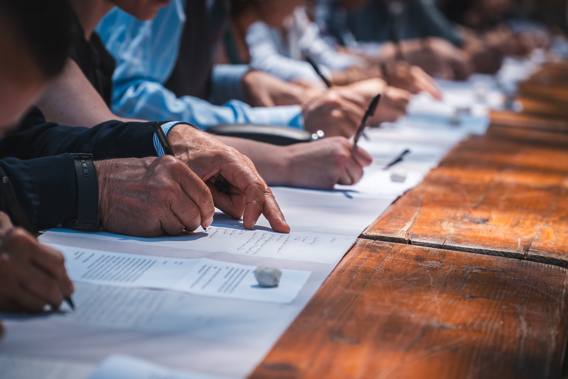 Tout commence par des lettres, jamais envoyées, écrites en contexte d'enfermement psychiatrique. Réactivées à la faveur d'appels à contribution, elles ont été retranscrites à la main par des volontaires lors de sessions de travail collectif (des scriptoriums), posant ainsi les bases d'une œuvre d'art participative. Cet engagement citoyen s'est prolongé avec l'envoi de ces écrits à des destinataires volontaires, dont les réponses demeurent confidentielles. Soustraits à leur fonction d'archive de l'aliénation, les textes sont ainsi restitués à leur puissance d'adresse. Nées d'une commande de la ville de Volterra en Toscane, en 2022, puis réactivées à plusieurs reprises en Italie, les Correspondances imaginaires s'enrichissent aujourd'hui d'une nouvelle étape, à partir des lettres des personnes internées à l'hôpital du Vinatier au début du XXe siècle.